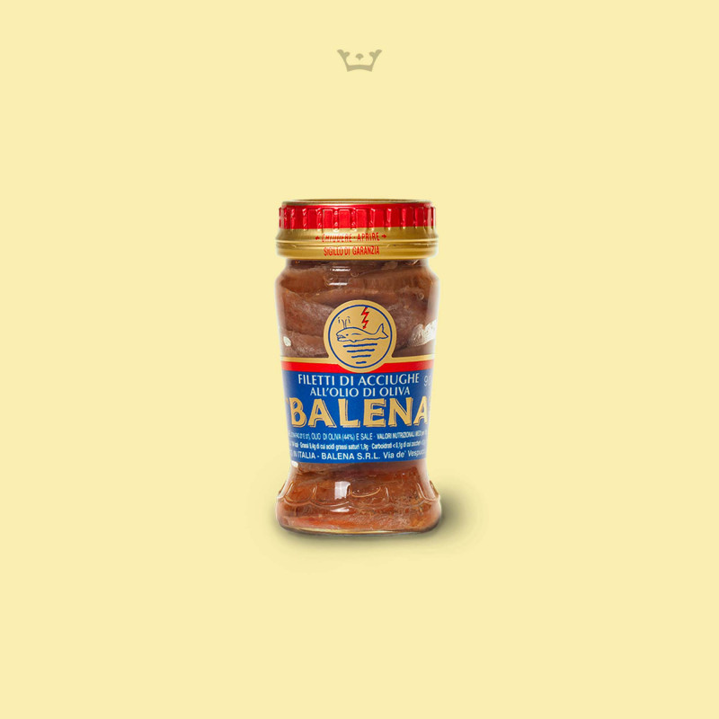 Acciughe in olio balena, vaso in vetro da 90g prodotte dalla storica azienda Toscana: "Balena".
