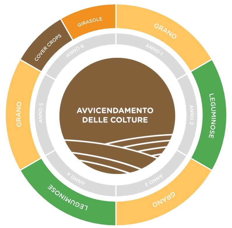 Mancini ad esempio attua una rotazione dei campi alternando annualmente su tutti i terreni il grano con piante leguminose, erba medica e girasoli al fine di non stressare il terreno con ripetute lavorazioni meccaniche oltre che di preservare la ricchezza di micro e macro nutrienti del suolo, ostacolando allo stesso tempo la perdita di biodiversità (fattore essenziale).