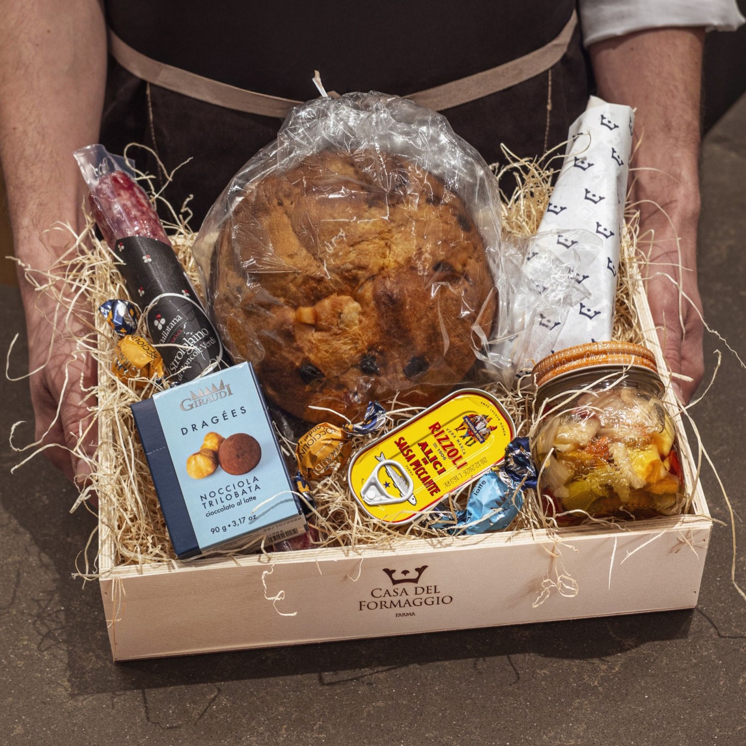 Cassetta di Natale by Casa del Formaggio Hai una persona cara che vuoi ringraziare a Natale? Regalagli un pacco natalizio che si ricorderà! La cassetta di Natale con prodotti tipici di Parma e del nostro territorio contiene : Panettone classico Filippi 1Kg Salame felino IGP Salumificio Ducale Vasetto funghi misti con porcini 280g Tavoletta Scaldaferro...