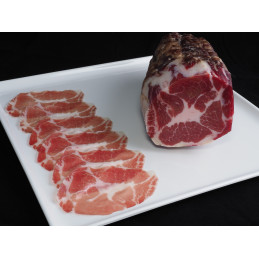 Spalla cruda trancio È il più antico salume della Bassa Parmense, ricavato dall’arto anteriore di suini pesanti nazionali, poco diffuso in commercio per la particolare abilità che richiede la lavorazione.  E' caratterizzata da un fetta marezzata dal gusto sapido, dal sapore intenso e dal profumo delicato. Stagionatura minima 11 mesi. Prodotto confezionato...