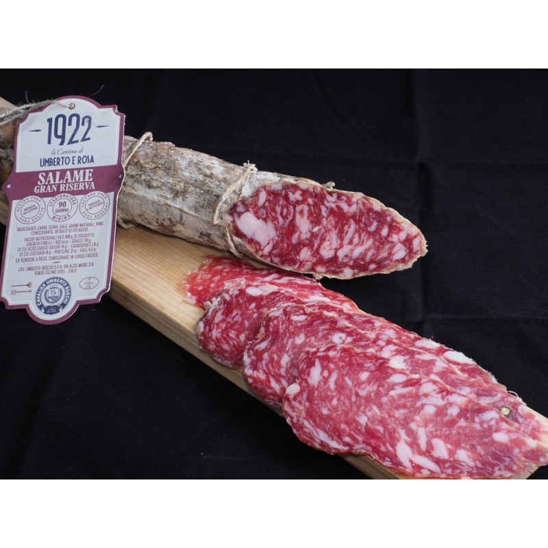 Salame Cav. Boschi Riserva di FamigliaIl Salame gran riserva di Cav. Boschi è prodotto con artigianalità e scelta accurata delle migliori carni.La produzione limitata e la stagionatura naturale di minimo 90 giorni garantiscono la sua esclusiva qualità.Confezione sottovuotoPrezzo: 46,00€/Kg ( pezzatura c.a. 800g)