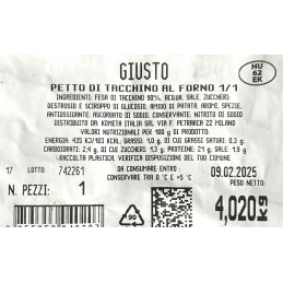 Fesa di tacchino 90%, acqua, sale, zuccheri: destrosio e sciroppo di glucosio, amido di patata, aromi, spezie, antiossidante: ascorbato di sodio, conservante : nitrito di sodio