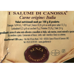Carne di suino nato allevato macellato in Italia, sale marino, aromi naturali, spezie