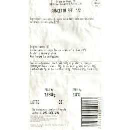 Pancetta Piacentina DOP arrotolata Pancetta affettata. Pancetta Piacentina arrotolata, stagionatura riserva. Ideale per accompagnare dei crostini di polenta fritta, per un antipasto goloso o per avvolgere arrosti. I salumi affettati vengono spediti in 3 confezioni da 100g cadauna, separate, in atmosfera protettiva. Il confezionamento tramite atmosfera...