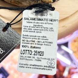 Ingredienti : carne di suino nero di Parma, sale, vino, pepe, conservanti : E252,E250, aromi naturali, spezie.