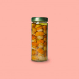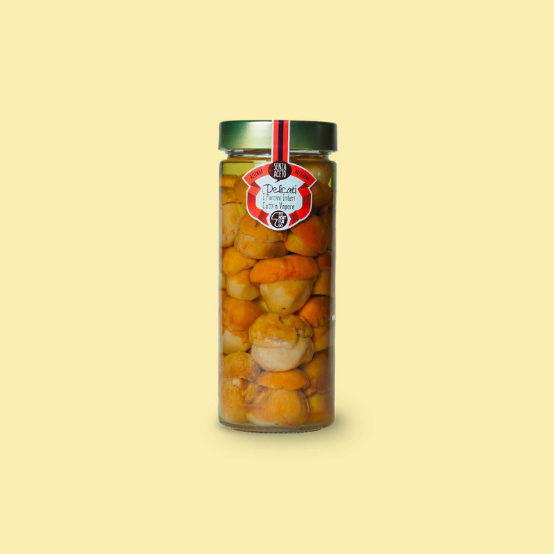 Funghi porcini interi che, dopo un'accurata selezione, vengono solo cotti al vapore per non modificarne il sapore e mantenerne le proprietà organolettiche e conservati in olio di oliva senza aceto.